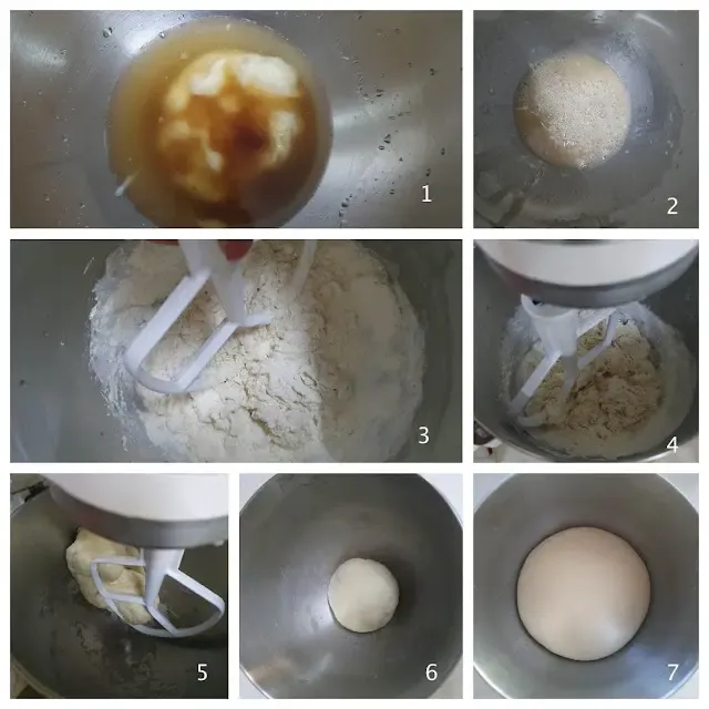 - Put all ingredients (except butter), including all the stiff starter into a bowl of stand mixer.