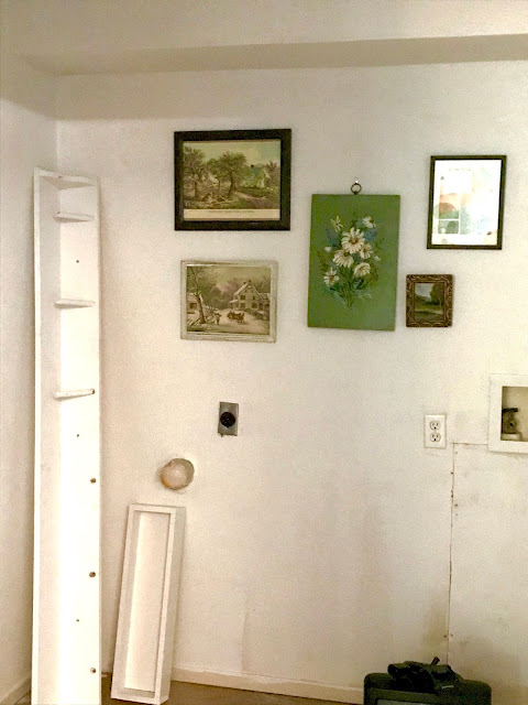 Shortly after we moved in, I took down the shelves so that I could get some paint on the walls and ceiling. As soon as the paint was dry, I hung up some art just so the room wouldn't be so depressing. The wall in the image below is in my line of sight from the kitchen.