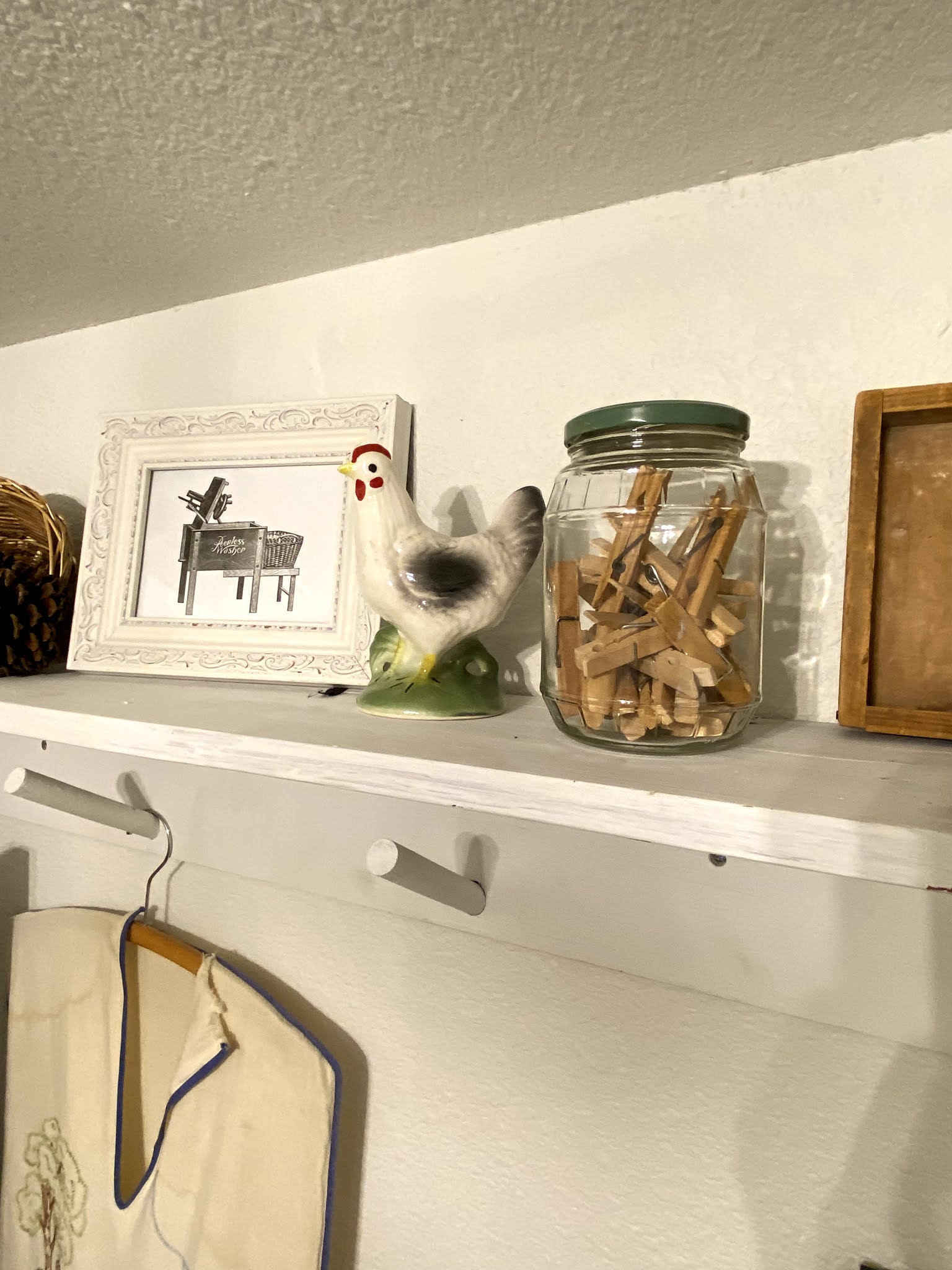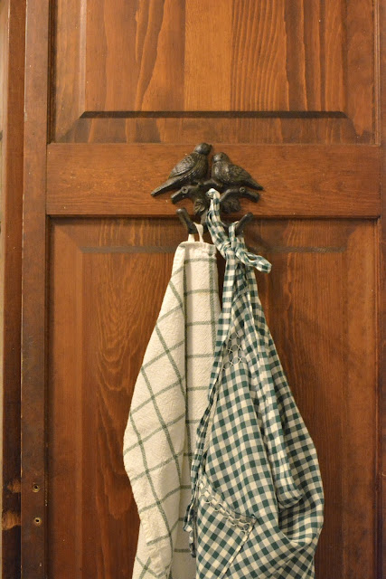 A darling bird hook from Hobby Lobby holds a vintage apron and a dish towel. Both are green which is our East Texas color.