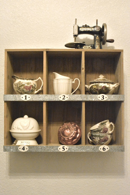 The Crate and Barrel inspired shelf is decorated with vintage finds and new baskets.