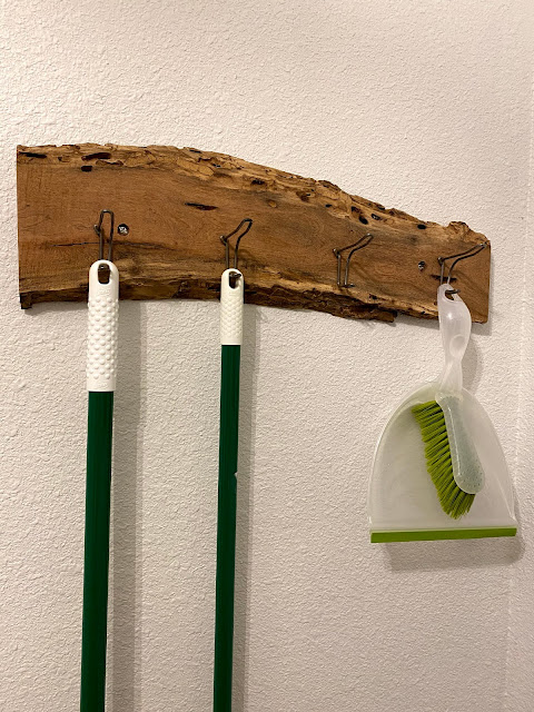 Bill hung up the shelf and peg rail. He made this ages ago after we saw one like it at Crate and Barrel in Dallas. I painted it because the pine had turned an orange color over the years.
