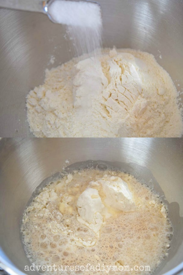 While the yeast is resting, add 3 1/2 cups of flour to your mixing bowl along with one teaspoon of salt.