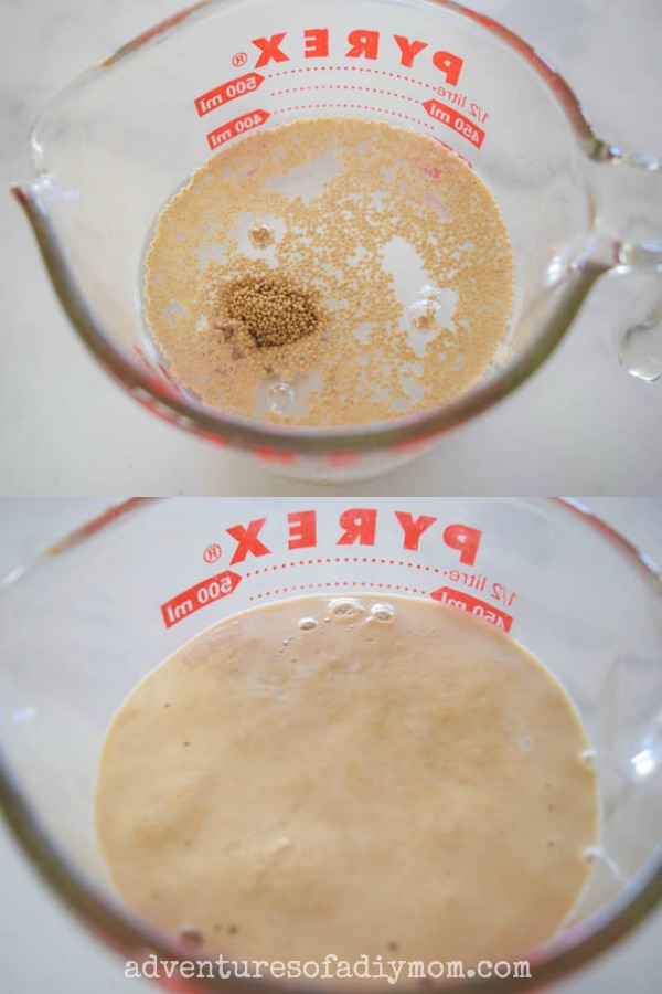 Add 2 Tbsp. of active dry yeast and 1 Tbsp. of sugar to the water, give it a stir and let it sit for about 5 minutes. The yeast will dissolve and expand. (see the bottom half of the above picture)