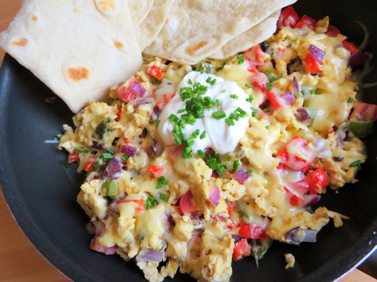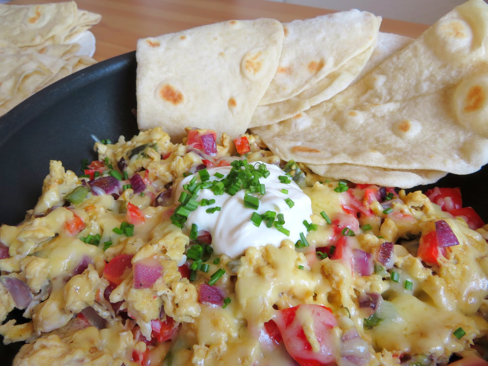 - Fold in the cooked vegetables and stir though. Scatter the cheese on top and allow to melt. Add a dollop of sour cream and sprinkle with spring onions or chives. Serve immediately with warm soft tortillas.